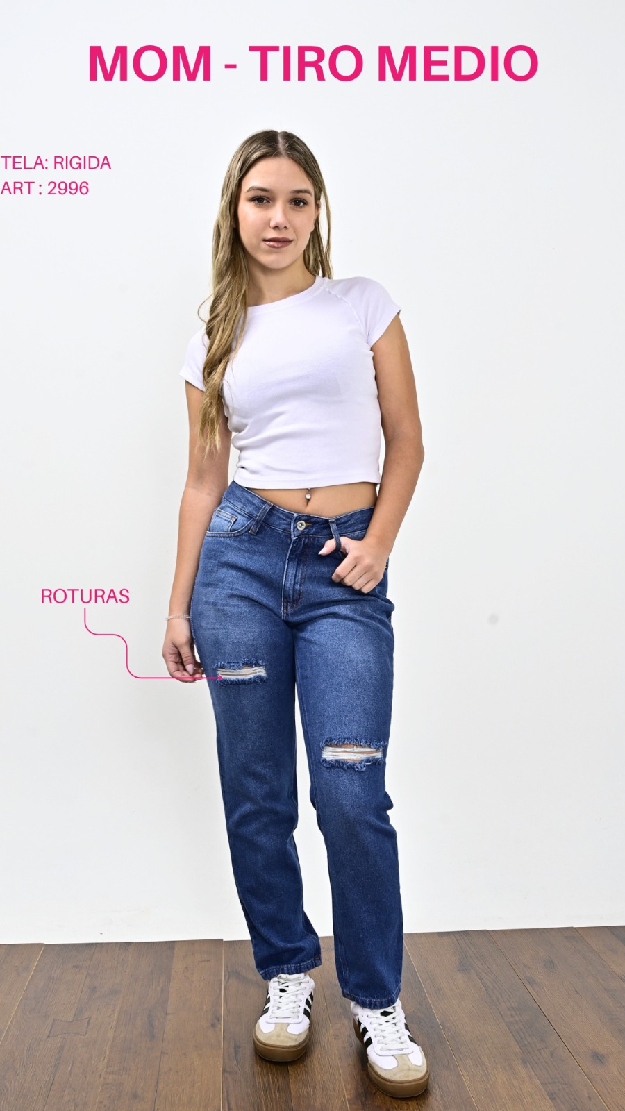 JD-2996 JEAN DIWAY MOM RIGIDO TIRO MEDIO CON ROTURAS cantidad